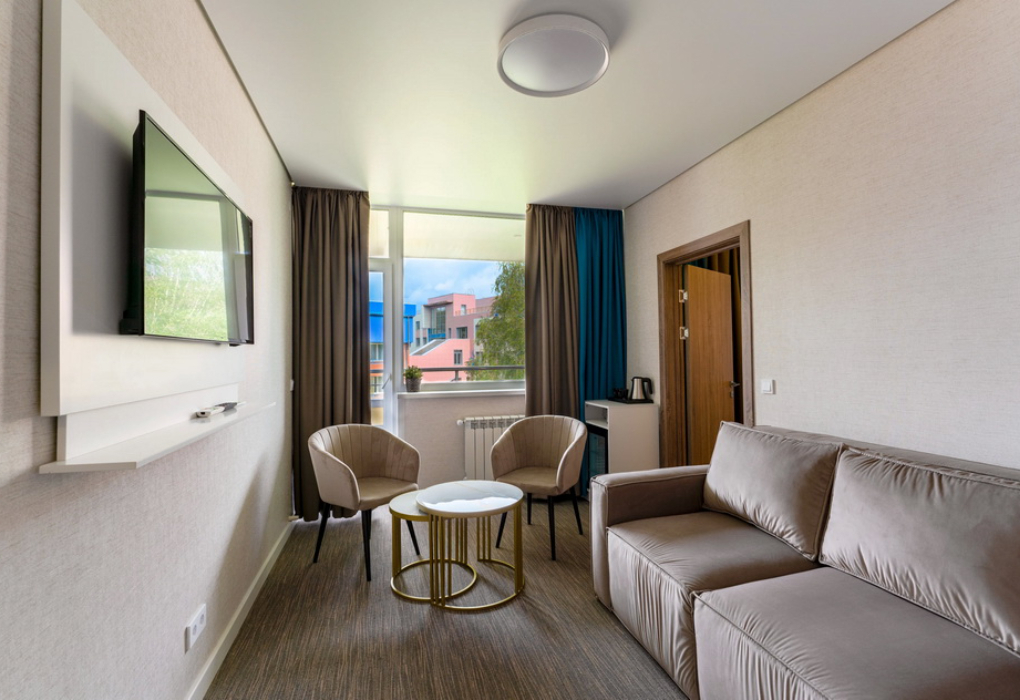 Площадь номера - 32 кв.м. 2 комнаты. 2 осн. места. в 1 и 3 корпусах. В номере: телевизор; холодильник; балкон; кондиционер; телефон; душ; фен; сейф; тапочки; Wi-Fi; утюг; туалетные принадлежности; 2-спальная кровать; стол; стулья; сушилка для белья; полотенца; чайная станция. 2 доп. места: