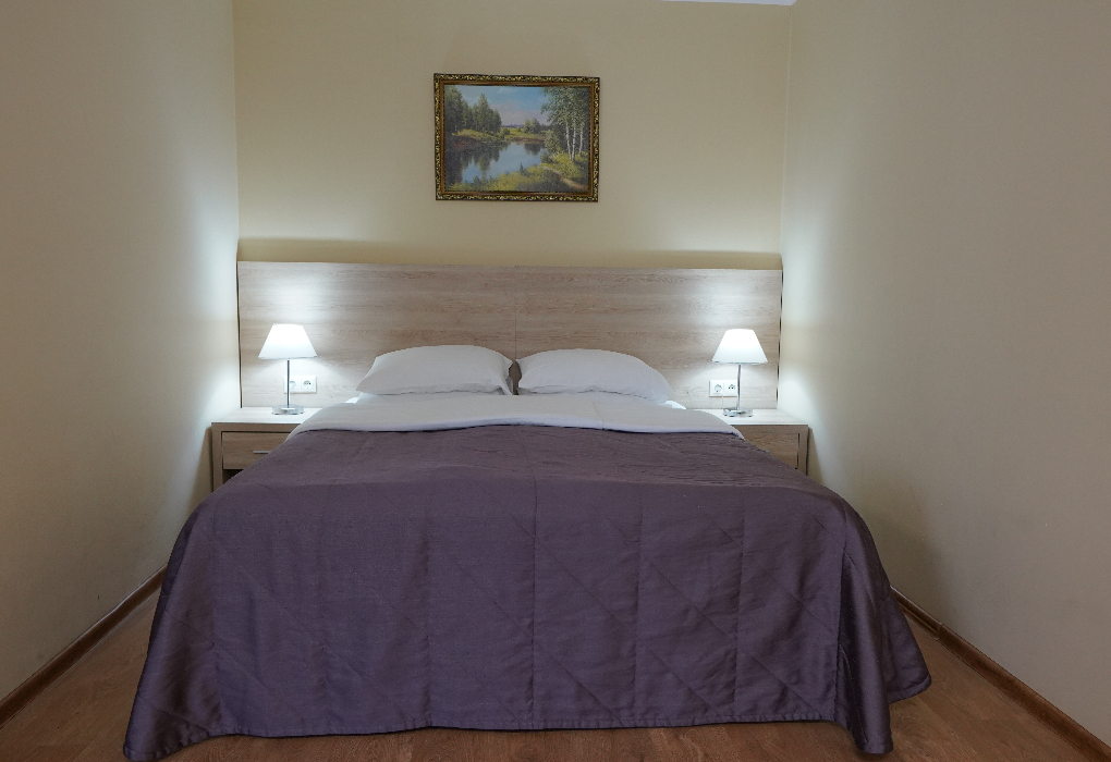 Площадь номера - 32 кв.м. 1 комната. 2 осн. места. в 1 и 3 корпусах. В номере: телевизор; балкон; кондиционер; телефон; душ; фен; сейф; тапочки; Wi-Fi; туалетные принадлежности; 2-спальная кровать; стол; мини-холодильник; стулья; сушилка для белья; полотенца; чайная станция. 2 доп. места: