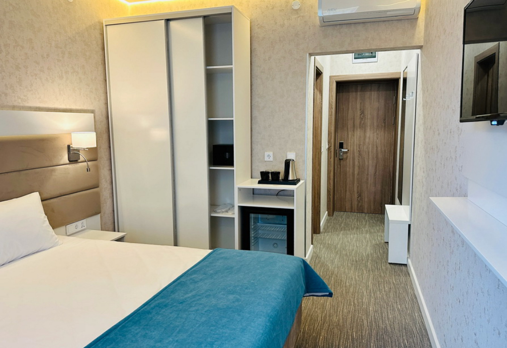 Площадь номера - 15 кв.м. 1 комната. 2 осн. места. в 1, 2, 3 корпусах. В номере: телевизор; балкон; кондиционер; телефон; душ; фен; тапочки; Wi-Fi; туалетные принадлежности; 1-спальные/ 2-спальная кровать; стол; мини-холодильник; стулья; сушилка для белья; полотенца; чайная станция.